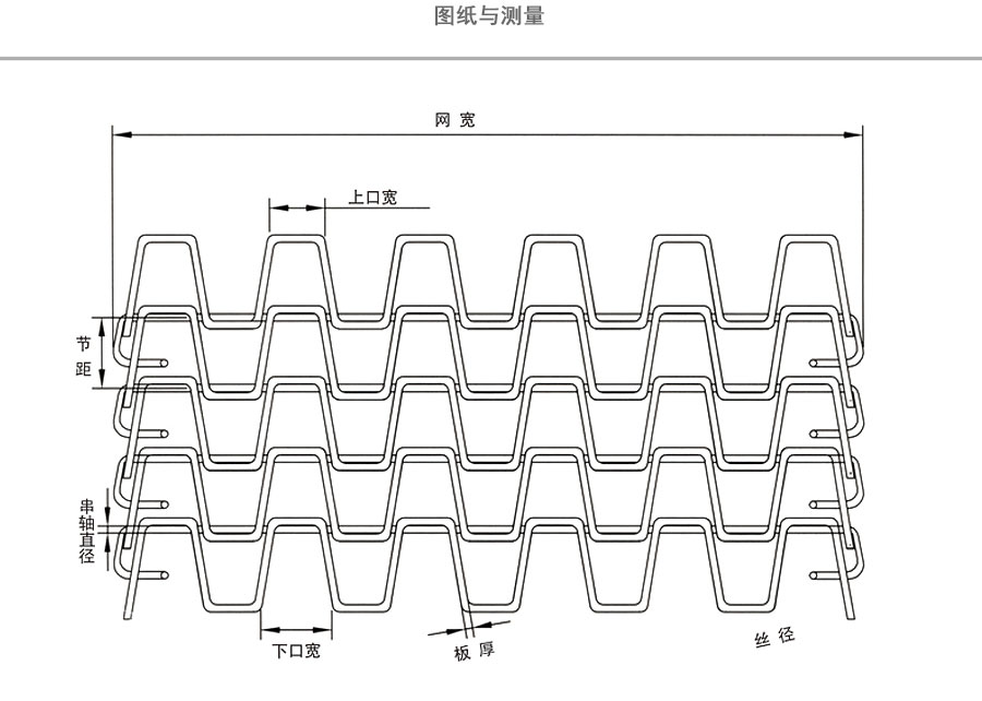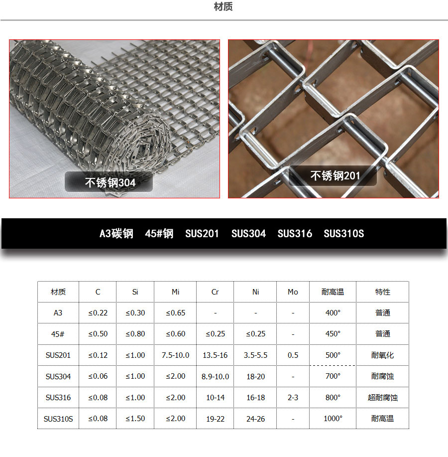 長城網帶材質:有A3低碳鋼、45#鋼、1Cr13耐熱鋼、 不銹鋼、304不銹鋼、1Cr18Ni9Ti不銹鋼、0Cr18Ni14NO2CU2耐熱耐酸鋼等